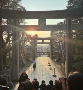 電車を乗り継いで神社に13時過ぎに着くと、整理券配布の列には既に30人ぐらい並んでいました。(まだ日の入りの5時間前です。)整理券には番号が書いてなくて、あくまでも神社の敷地に入るための入場券にすぎないということでした。つまり、一度列を抜けたら後ろから並び直さないといけない制度のようです。しかし、前後のおじさん達に「交代で並びませんか」と提案すると快諾してくれたので、2時間ほどの散策時間を確保できました。列に戻ってから3人で話していると、1人は3週間かけて東京から九州を車で旅をしている人、もう1人は写真が趣味で日本各地の写真を撮り続けている人で自分の知らない世界を知る貴重な時間になりました。肝心の夕日は一番いいところで鳥居に少し隠れましたが、快晴の下で見られただけで大満足でした。