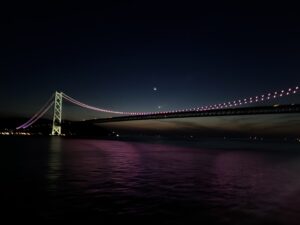 期待に胸を膨らませてフェリーに乗り込み、旅行スタートです。ライトアップした明石海峡大橋をくぐる時刻に合わせて甲板に出ると、海上の夜は信じられない寒さでした。でも、明石海峡大橋、なかなか写真映えして良かったです。