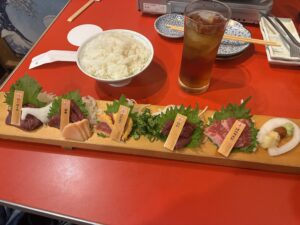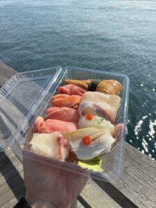 唐戸市場では名物寿司バトルに参戦してきました。どれを食べようかと考えながらゆっくり過ごす時間は僕にはないので、あらかじめどの店で何を買う、という戦略を立てた上で臨みました。市場に着いた頃には既に人気店には数十人の行列ができていましたが、計画通りにお目当てのお寿司たちを揃えることができました。晴れ渡る空の下、関門海峡を眺めながら食べるお寿司は言うまでもなく絶品。贅沢なブランチでした。