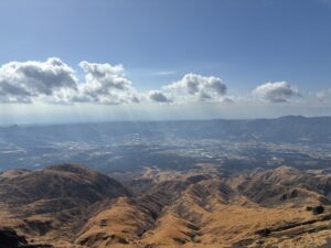 風が強すぎて最高峰までは行けなかったのですが、景色が一番良いところまでは登れたので初登山でしたが大満足です。最近阿蘇山の火口に観光用ヘリが墜落して火口には近づけない状態だったのですが、登山をしたことで火口からの煙を上から直接見れたという思いがけない良いこともありました。結果的に大観峰よりも随分高い所からカルデラの景色を見れたので、大観峰に賭けずに登山を選んだことは大正解でした。